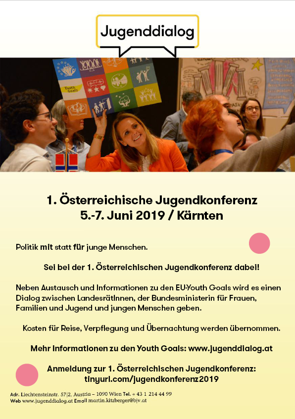 Politik FÜR junge Menschen soll MIT jungen Menschen gestaltet werden. Dafür möchte die Bundesjugendvertretung effektiv junge Menschen einbinden, vernetzen und ermächtigen - und damit die EU-Jugendstrategie in Österreich umsetzen und in alle Bundesländer bringen. Die Koordinierungsstelle Jugenddialog organisiert in Zusammenarbeit mit der Bundesjugendvertretung, den Landesjugendreferaten und dem Bundeskanzleramt von 05.-07. Juni die 1. Österreichische Jugendkonferenz. Ein wichtiger Programmteil wird dabei der Dialog mit allen LandesrätInnen, der Bundesministerin für Frauen, Familien und Jugend Juliane Bogner-Strauß und jungen Menschen sein! Der Fokus der 1. Österreichischen Jugendkonferenz liegt auf den Youth Goals. Rund 60 junge Menschen werden auf der Konferenz gemeinsam über die Zukunft von Arbeit, Bildung und Chancen für junge Menschen im ländlichen Raum zu diskutieren. Die insgesamt elf Youth Goals sind Teil der EU-Jugendstrategie 2019-2027. Sie geben die Richtung der gemeinsamen Jugendpolitik in der EU vor. Sie spiegeln die Ansichten junger Menschen in ganz Europa wider. Der Schwerpunkt liegt bei den drei Goals: * Ziel 6: Jugend im ländlichen Raum voranbringen * Ziel 7: Gute Arbeit für alle * Ziel 8: Gutes Lernen Details im Überblick: Die Jugendkonferenz findet von 05.-07. Juni in Kärnten statt. Die Teilnahme ist kostenlos, Fahrt- und Nächtigungskosten werden übernommen. Die Anmeldung ist bis 21. April unter folgendem Link möglich.