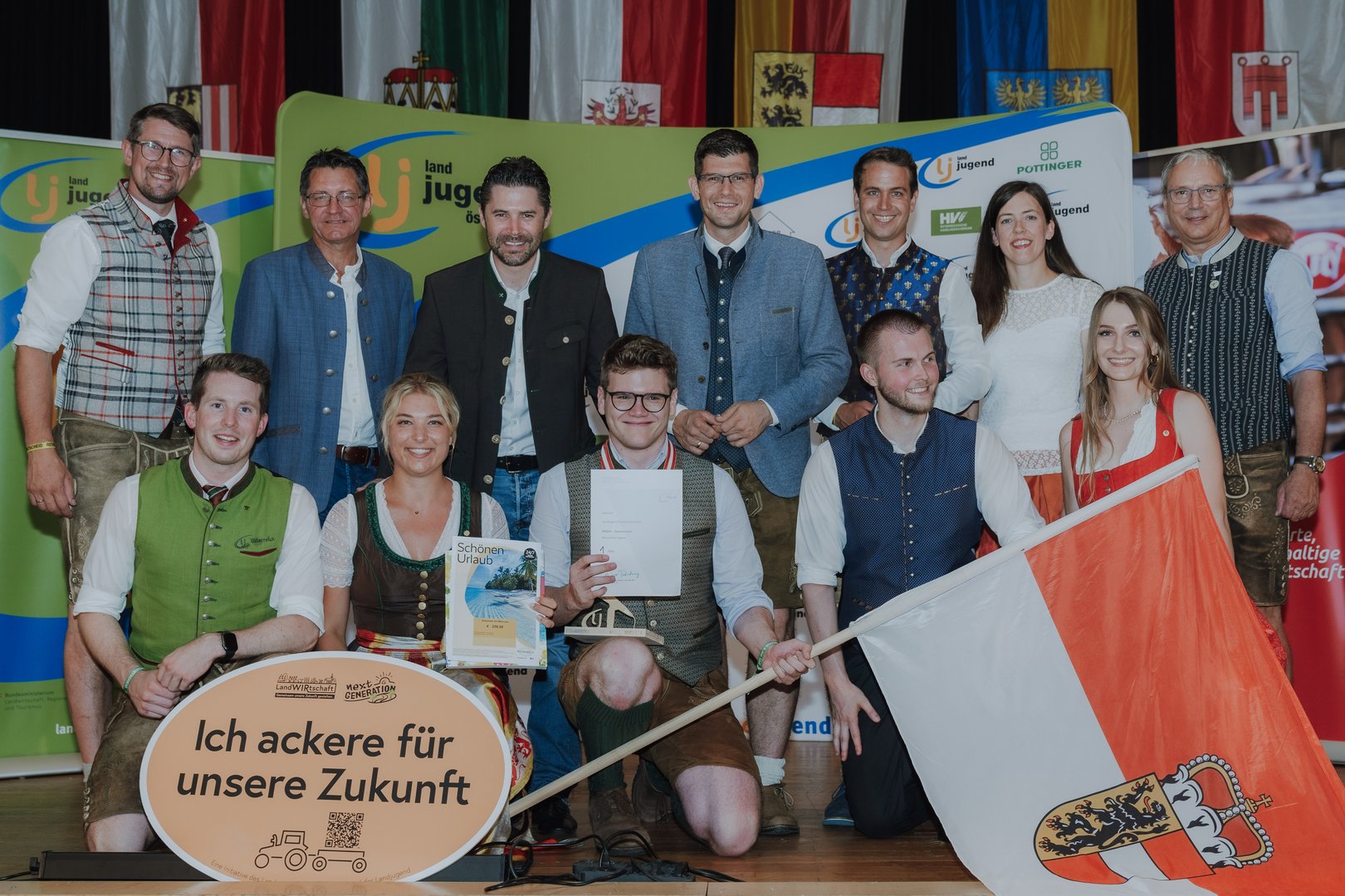 Bild 5: Sieger Spontanrede mit Ehrengästen: hinten vlnr.: Landeskammerrat Thomas Rinner, Präsident der Landwirtschaftskammer Kärnten Siegfried Huber, Geschäftsführer des Kärntner Raiffeisen Marketings Christopher Weiss, Landeshauptmann- Stellvertreter Martin Gruber, Vizepräsident der Landwirtschaftskammer Kärnten Kammerrat Roman Linder, BA MA, DI Elisabeth Petauschnig Leiterin der Sparte Agrar Abteilung seitens des Maschinenrings Kärntens, Direktor der LFS Althofen Ing. Sebastian Auernig, vorne vlnr: Bundesleiter Markus Buchebner, Landesleiterin Julia Moser, Bundessieger Maximilian Aigner, Landesleiter Felix Götzhaber, Bundesleiterin Valentina Gutkas