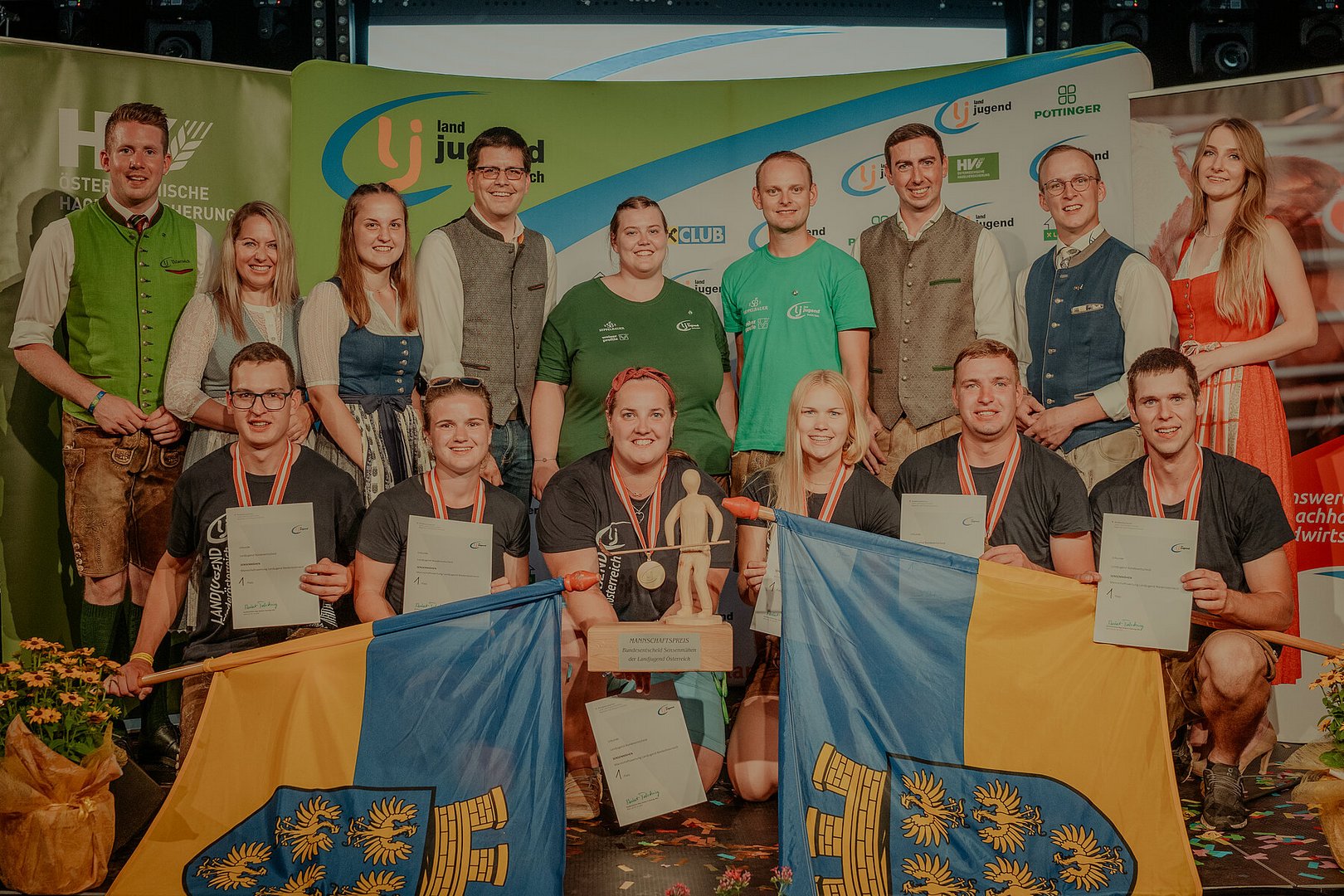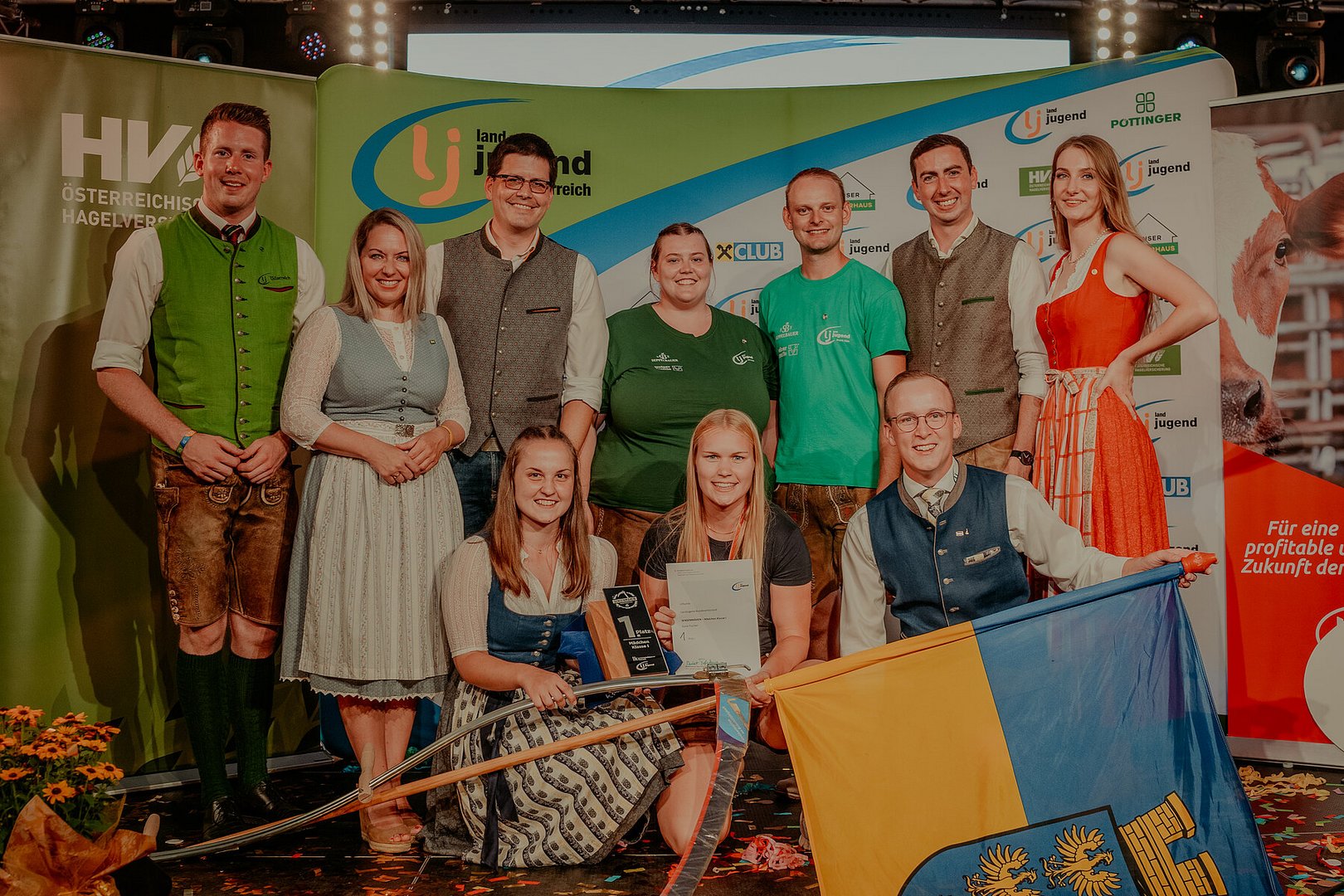 Bild 5: Bundessieger Burschen Juniorenklasse Valentin Schardax (hinten vlnr.: Bundesleiter Markus Buchebner, Abgeordnete zum NÖ Landtag Silke Dammerer, Vizepräsident der Landwirtschaftskammer Niederösterreich Ing. Lorenz Mayr, Bezirksleiterin Katja Prochazka, Bezirksleiter Andreas Fromhund, MEP DI Alexander Bernhuber, Bundesleiterin Valentina Gutkas, vorne vlnr.: Landesleiterin Sabine Pfeisinger, Bundessieger Valentin Schardax, Landesleiter Markus Höhlmüller)