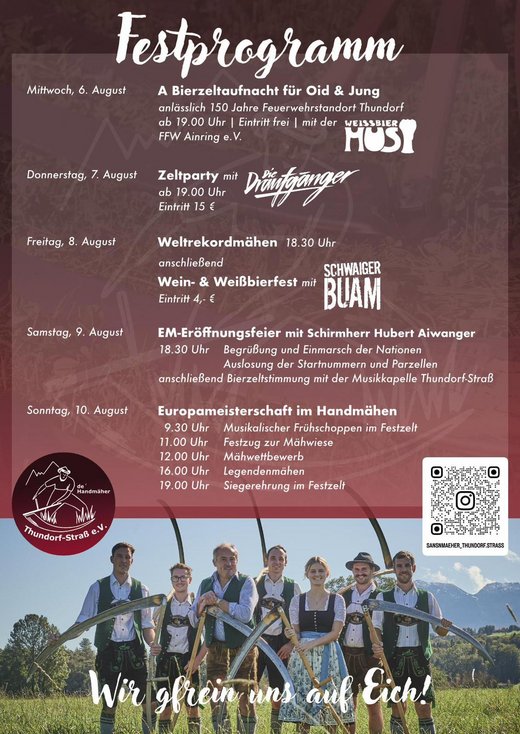 Die Europameisterschaft im Sensenmähen findet am Sonntag, 10. August 2025 in Thundorf/Ainring in Deutschland statt. Am Bewerbstag erwartet die Besucher:innen um 9:30 Uhr im Festzelt ein Frühschoppen. Um 11 Uhr folgt der Festumzug zur Bewerbsfläche. Um 12 Uhr geht der Bewerb los. Österreich ist bei dieser Europameisterschaft in den Kategorien: Herren, Damen, Junioren, Juniorinnen, Jugend vertreten. Zudem gehören dem Nationalteam Mannschaftsbeteuer, Juroren, ein Oberrichter und Zeitnehmer:innen an, die zum Gelingen des Bewerbs und dem Erfolg des Teams beitragen.
