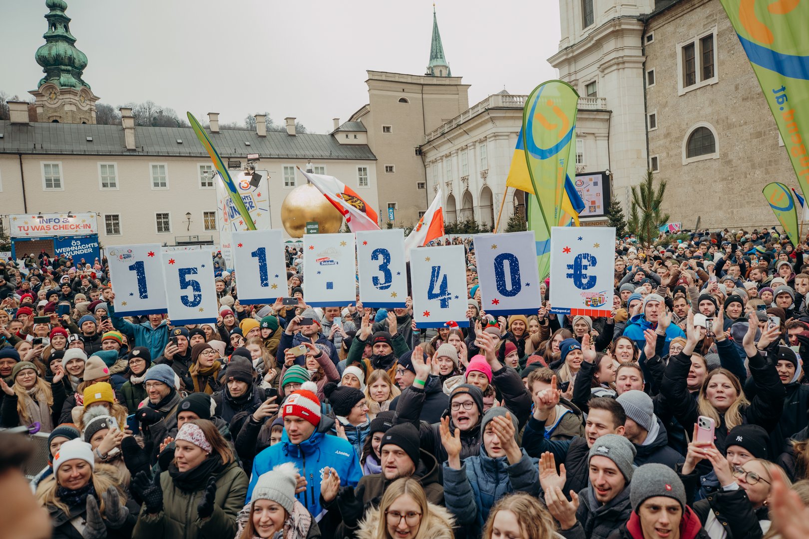 Hunderte Landjugend-Mitglieder aus allen drei Bundesländern sind am Sonntag nach Salzburg gereist, um vor der gläsernen Wunschhütte am Kapitelplatz bei der Übergabe der Landjugend-Sammelspende mit dabei sein zu können. Die Stimmung war einmalig und stellte eine Mischung aus hoffnungsvoller Aufregung und einem Wahnsinns Gemeinschaftsgefühl dar. Die Spendensumme wurde der Ö3-Gemeinde schließlich auch von der Landjugend-Community präsentiert: Riesige Schilder mit Zahlen verrieten den Spendenbetrag. Die Summe von 151.340 € verschlug dem sonst so redegewandten Moderatorentrio rund um Tina Ritschl, Andi Knoll und Philipp Hansa die Sprache. Als Wunschsong gab es wie auch schon in der Vergangenheit die Landjugend-Hymne „Wir san dabei“, die von den anwesenden Landjugend-Mitgliedern lautstark mitgesungen wurde.