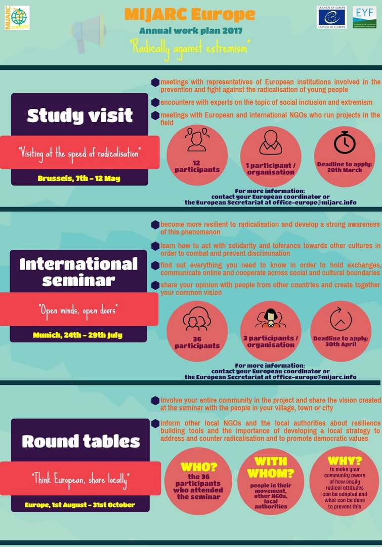 Du möchtest dich in einem internationalen Team mit dem Thema Radikalisierung und Extremismus inhaltlich auseinandersetzen und beim „Study Visit“ der MIJARC von 7.-12. Mai in Brüssel teilnehmen? Dann bewirb dich JETZT! Anforderungen · zwischen 18 – 30 Jahre · aktiv in der Landjugend engagiert · interessiert am Thema · gute Englischkenntnisse · Internetzugang · bereit aktiv mitzuarbeiten Bewerbung: Sende deine uns deine ausgefüllte Bewerbung bis spätestens Sonntag, 12. März an oelj(at)landjugend.at – die Landjugend Österreich nominiert aus allen BewerberInnen eine Person und leitet deren Bewerbung bis 20. März an die MIJARC weiter! Personen die auch am internationalen Seminar teilnehmen können, werden bevorzugt! Kosten: Reisekosten sind vom Teilnehmer zu tragen (es werden bis zu € 275 rückerstattet) Nähere Infos zur Ausschreibung sowie zu den Anforderungen – siehe Ausschreibung!