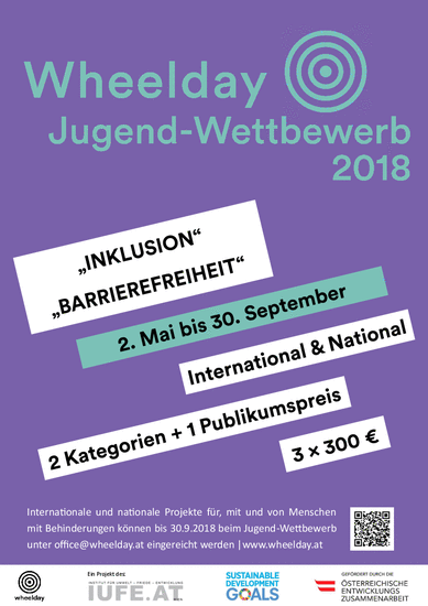 "Man ist nicht behindert, man wird behindert" Das Institut für Umwelt, Friede und Entwicklung (IUFE) prämiert im Rahmen der Initiative „Wheelday. Entwicklung bewegt!“ wieder dein Vorhaben, welches einen Beitrag zur Inklusion und Barrierefreiheit in Österreich und der Welt leistet. Aktivitäten im Kontext der Entwicklungszusammenarbeit und andere Projekte sind willkommen. Den Rahmen des diesjährigen Wettbewerbes bilden die Sustainable Development Goals (SDGs).